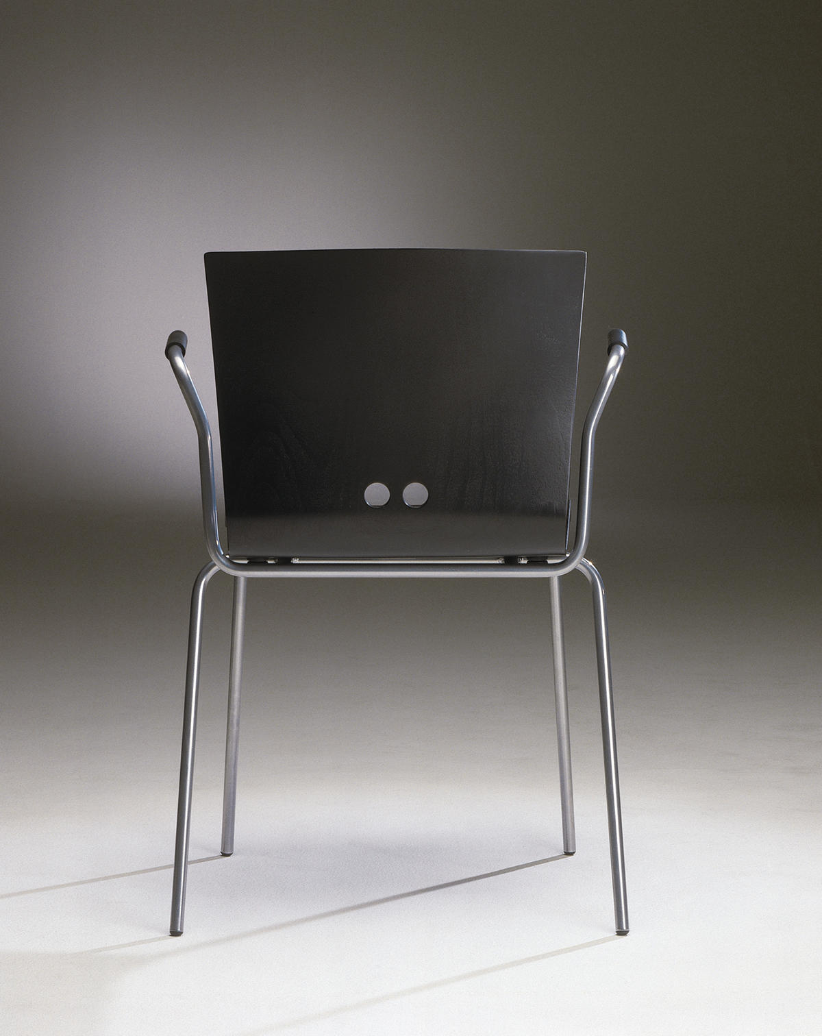 To give the chair a nice handle, combined with a significant character (both very often missing on those kinds of chairs), I added the two holes to the shape.