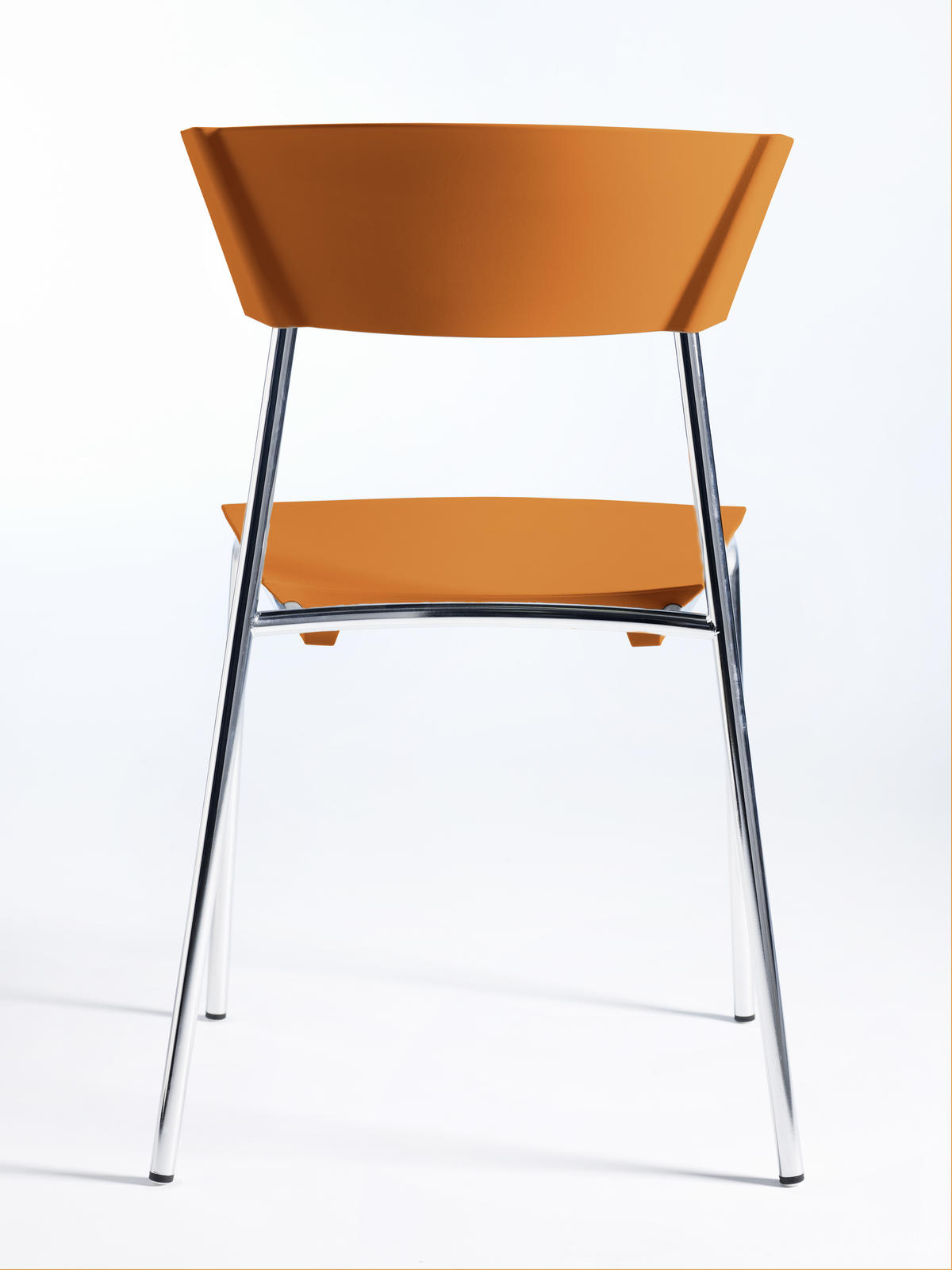 There is an integrated stacking spacer under the seat which facilitates quiet stacking without leaving marks on the chair underneath. The chair is shock resistant, cleanable and when fitted with the optional galvanized frame, can be used outdoors. The standard frame is in chromed steel and the seat/back are available in different striking colours.