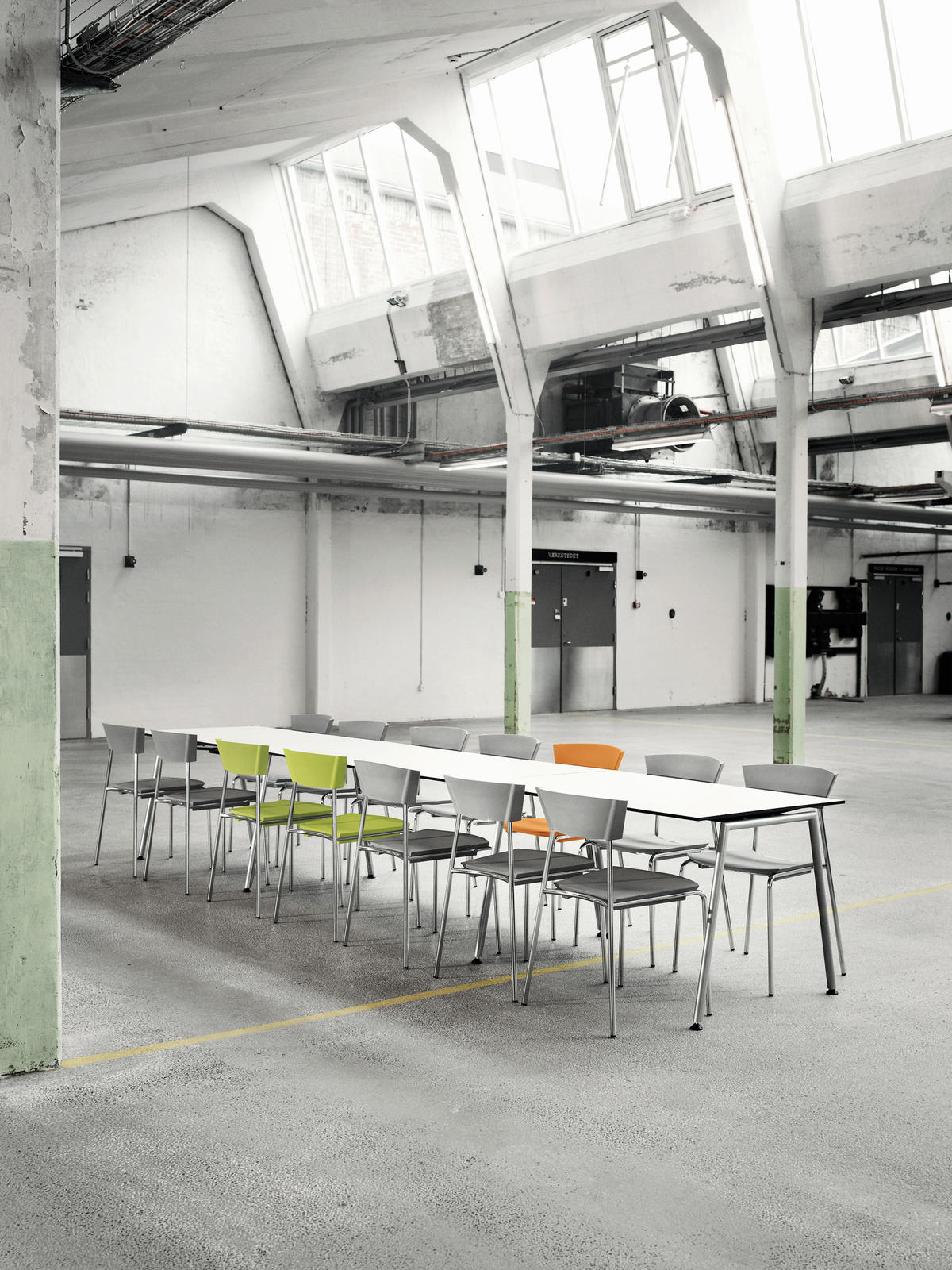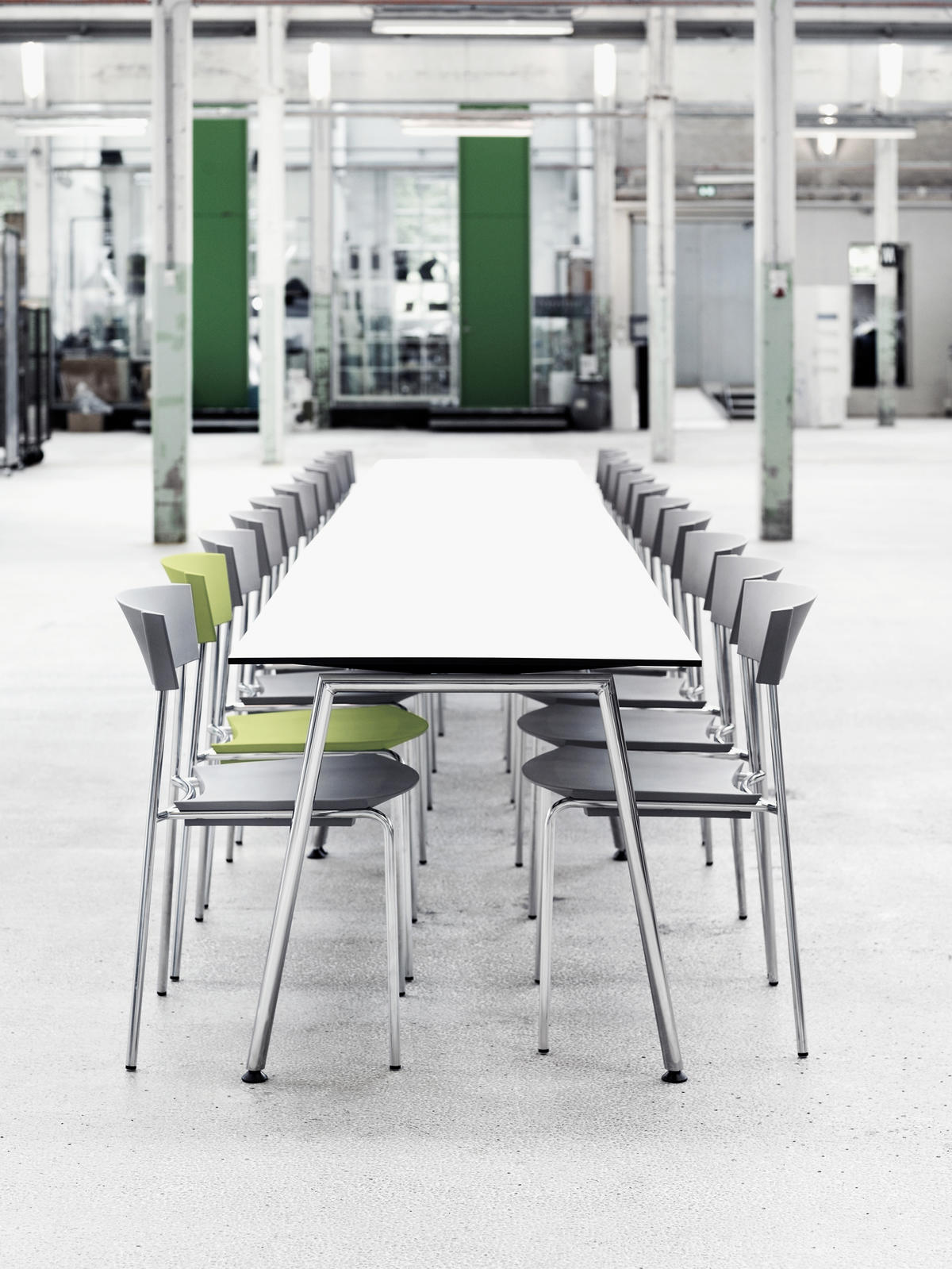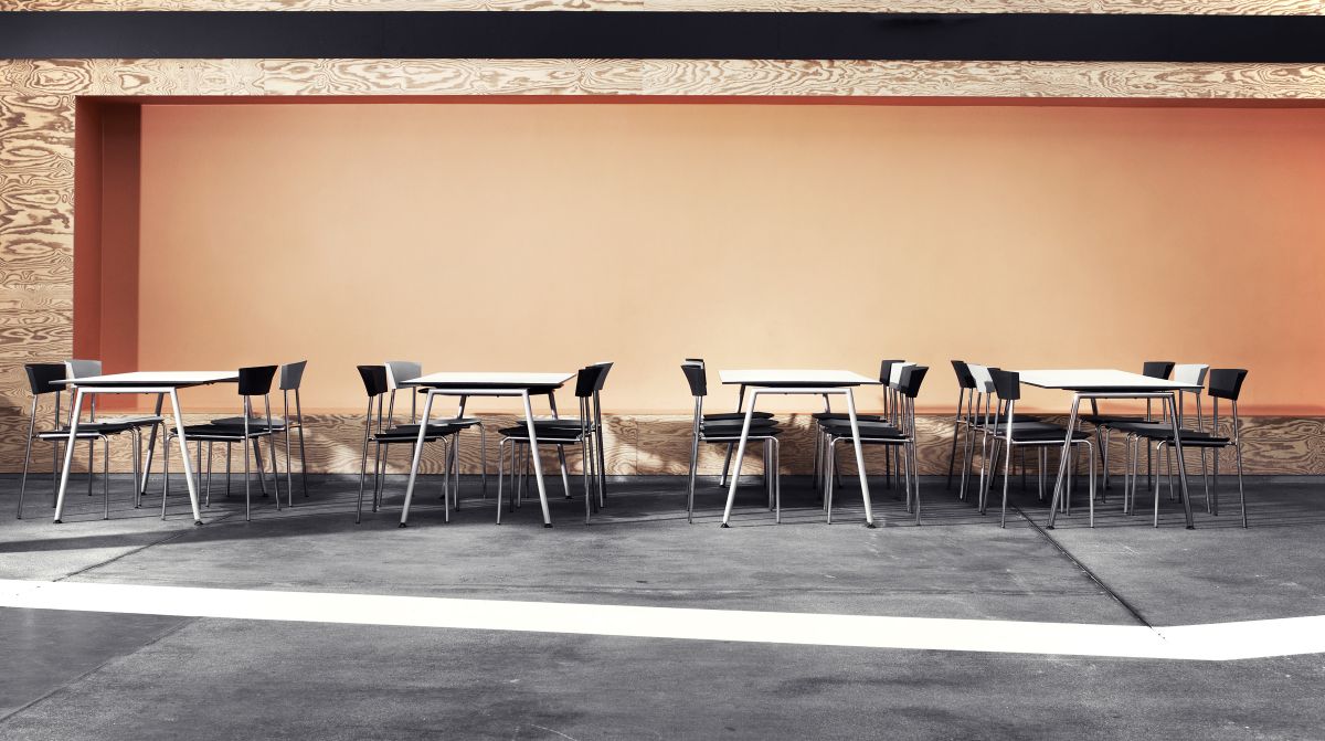 The sleek design of the TORO table system fits well with the more sculptural design of the TORO chair. The table system offers both single tables for cafeterias or meeting rooms, and linked table arrangements with a reduced number of legs by using the “double-gables” which connect two tabletops. These long configurations are not only cost-effective and resource-saving, but also contribute architecturally to a room with calmness and simplicity.