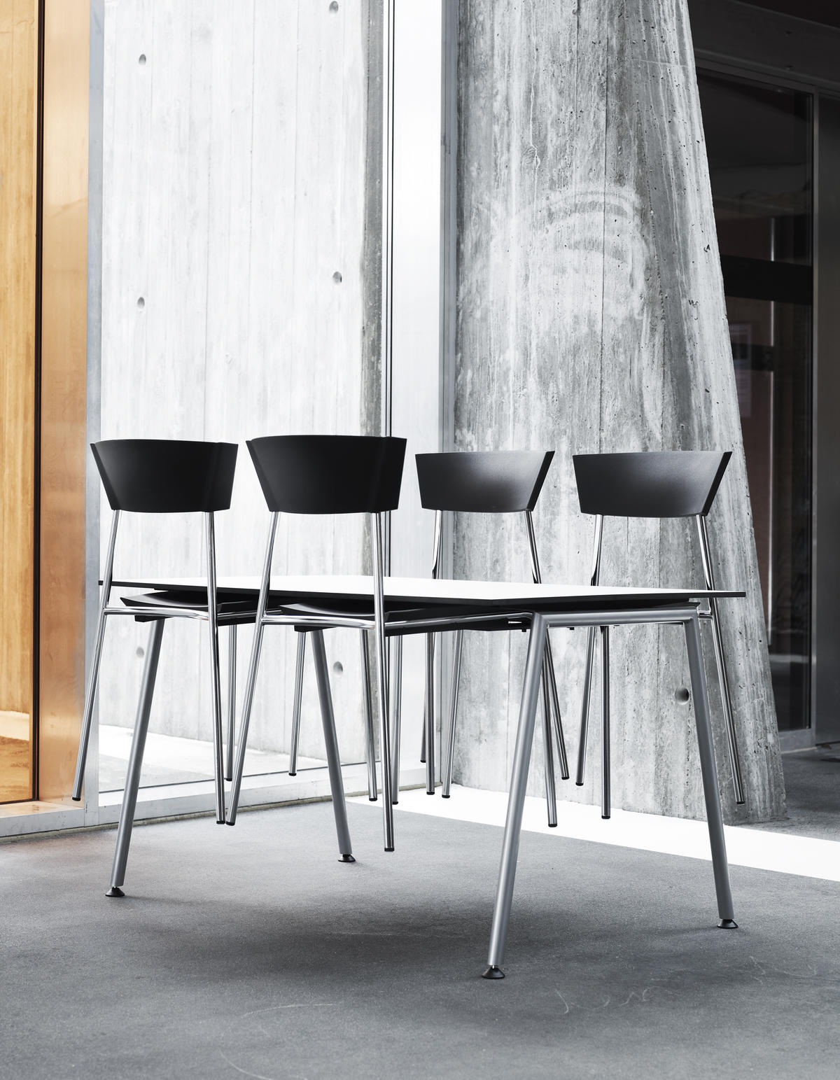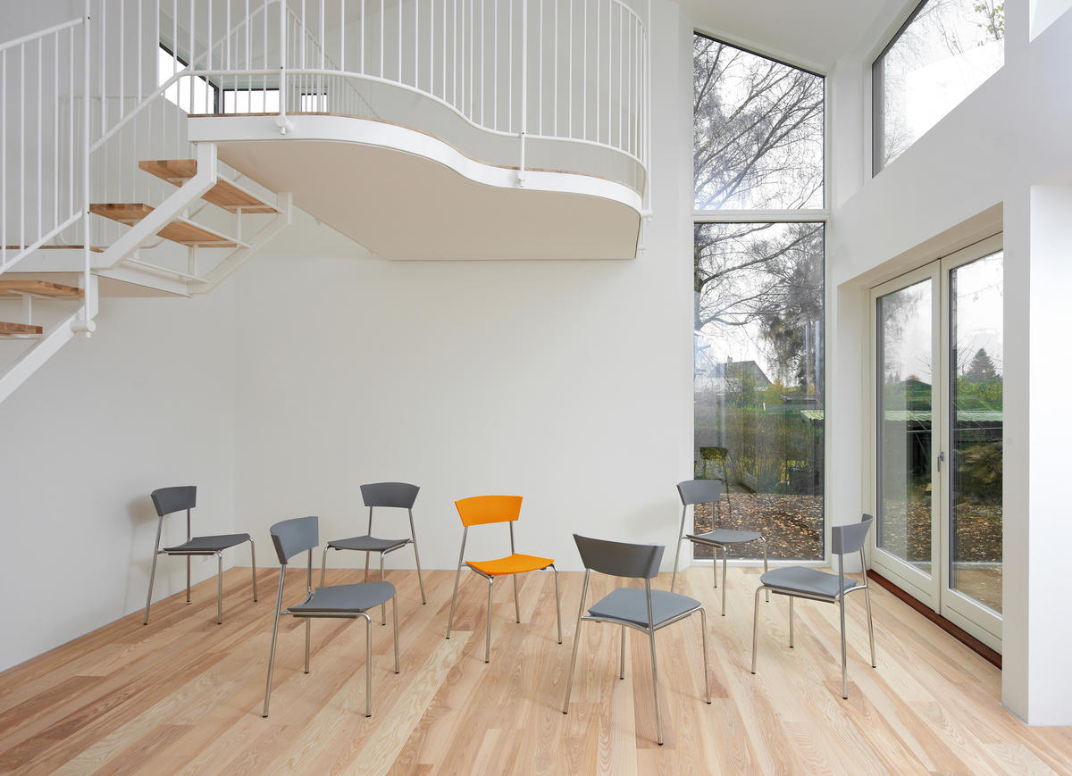 The sculpted and strong double curved shape of the back fully demonstrates the design possibilities of moulding the elastic polyurethane material. This contributes to the chair’s exceptional comfort – whether you sit slightly forward, for example when you eat, or whether you lean back listening to a lecture.